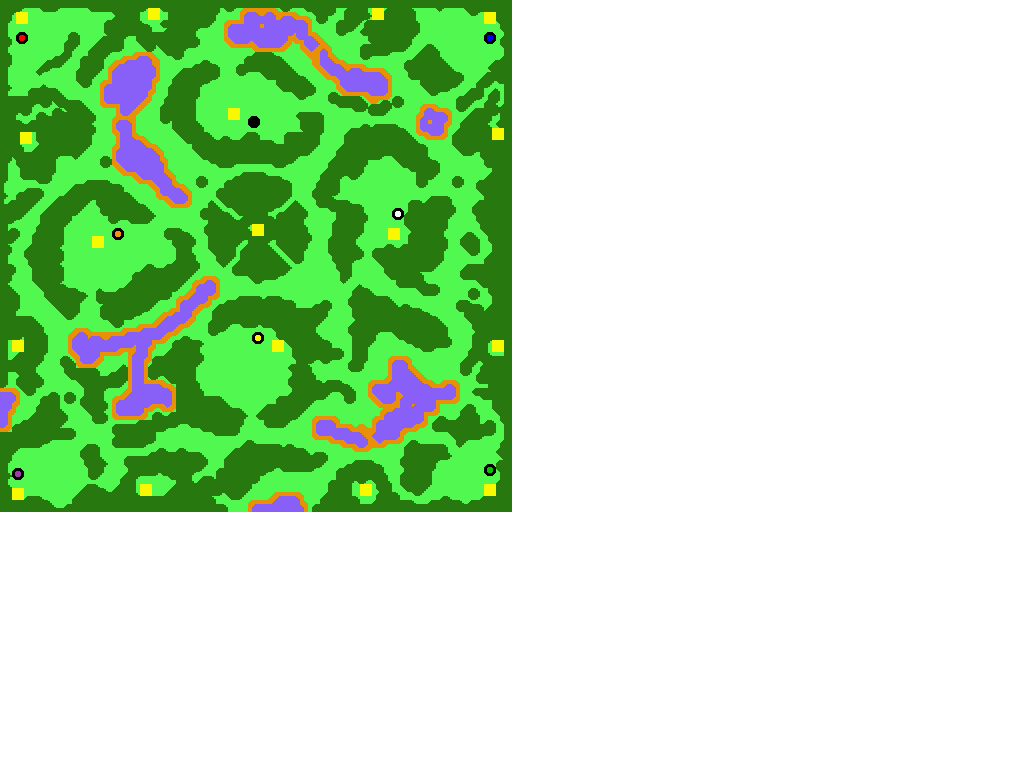 File Name: KPdrkfst.pud Description: Dark Forest Dimensions: 128 x 128 Terrain: Forest No Players: 8 % Open Land: 45 % Forest: 48 % Water: 7 % Mountains: 0 Total Gold: 780,000 (17 mines) Total Oil: 0 Total Lumber: 631,700 Start Mines: 50,000 Other Mines: 35,000 - 100,000 Player 1 (Red) Person - Human (G=8000 L=5000 O=2000) 1 Peasant 1 Farm 1 Town Hall Player 2 (Blue) Person - Human (G=8000 L=5000 O=2000) 1 Peasant 1 Farm 1 Town Hall Player 3 (Green) Person - Human (G=8000 L=5000 O=2000) 1 Peasant 1 Farm 1 Town Hall Player 4 (Purple) Person - Human (G=8000 L=5000 O=2000) 1 Peasant 1 Farm 1 Town Hall Player 5 (Orange) Person - Orc (G=8000 L=5000 O=2000) 1 Peon 1 Pig Farm 1 Great Hall Player 6 (Black) Person - Orc (G=8000 L=5000 O=2000) 1 Peon 1 Pig Farm 1 Great Hall Player 7 (White) Person - Orc (G=8000 L=5000 O=2000) 1 Peon 1 Pig Farm 1 Great Hall Player 8 (Yellow) Person - Orc (G=8000 L=5000 O=2000) 1 Peon 1 Pig Farm 1 Great Hall