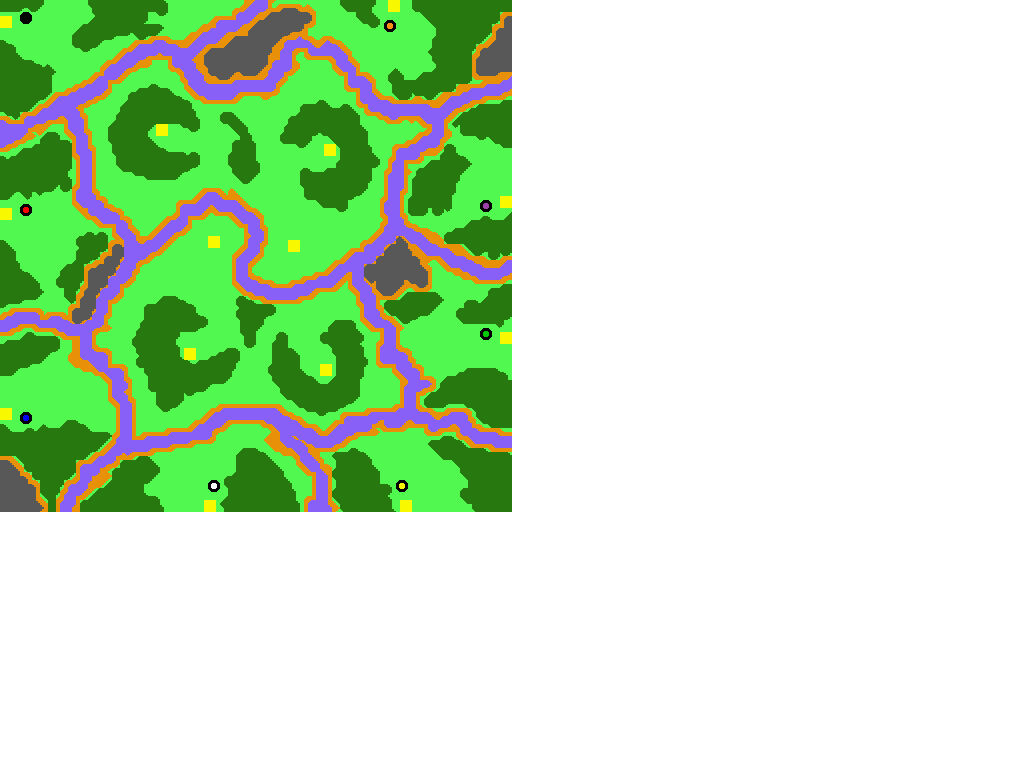 File Name: KPhpcomb.pud Description: High Plains Combat by Bacchus Dimensions: 128 x 128 Terrain: Forest No Players: 8 % Open Land: 51 % Forest: 31 % Water: 14 % Mountains: 4 Total Gold: 850,000 (14 mines) Total Oil: 0 Total Lumber: 413,500 Start Mines: 60,000 Other Mines: 45,000 - 95,000 Player 1 (Red) Person - Human (G=2000 L=1500 O=3000) 1 Peasant 1 Farm 1 Town Hall 1 Elven Lumber Mill Player 2 (Blue) Person - Orc (G=2000 L=1500 O=3000) 1 Peon 1 Pig Farm 1 Great Hall 1 Troll Lumber Mill Player 3 (Green) Person - Human (G=2000 L=1500 O=3000) 1 Peasant 1 Farm 1 Town Hall 1 Elven Lumber Mill Player 4 (Purple) Person - Orc (G=2000 L=1500 O=3000) 1 Peon 1 Pig Farm 1 Great Hall 1 Troll Lumber Mill Player 5 (Orange) Person - Human (G=2000 L=1500 O=3000) 1 Peasant 1 Farm 1 Town Hall 1 Elven Lumber Mill Player 6 (Black) Person - Orc (G=2000 L=1500 O=3000) 1 Peon 1 Pig Farm 1 Great Hall 1 Troll Lumber Mill Player 7 (White) Person - Human (G=2000 L=1500 O=3000) 1 Peasant 1 Farm 1 Town Hall 1 Elven Lumber Mill Player 8 (Yellow) Person - Orc (G=2000 L=1500 O=3000) 1 Peon 1 Pig Farm 1 Great Hall 1 Troll Lumber Mill