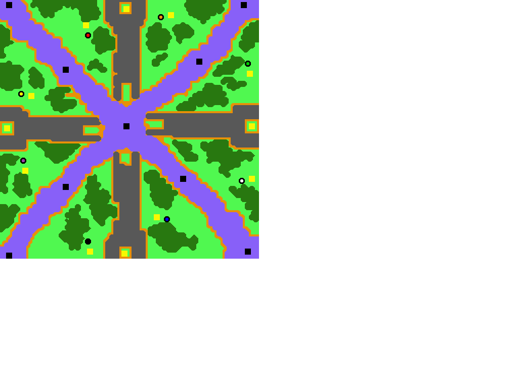 File Name: KP8cross.pud Description: 8 Cross by Anvil Dimensions: 128 x 128 Terrain: Forest No Players: 8 % Open Land: 39 % Forest: 22 % Water: 23 % Mountains: 16 Total Gold: 960,000 (12 mines) Total Oil: 240,000 (9 patches) Total Lumber: 288,900 Start Mines: 70,000 Other Mines: 100,000 Player 1 (Red) Person - Human (G=4000 L=2000 O=2000) 1 Peasant 1 Farm 1 Town Hall 1 Elven Lumber Mill Player 2 (Blue) Person - Orc (G=4000 L=2000 O=2000) 1 Peon 1 Pig Farm 1 Great Hall 1 Troll Lumber Mill Player 3 (Green) Person - Human (G=4000 L=2000 O=2000) 1 Peasant 1 Farm 1 Town Hall 1 Elven Lumber Mill Player 4 (Purple) Person - Orc (G=4000 L=2000 O=2000) 1 Peon 1 Pig Farm 1 Great Hall 1 Troll Lumber Mill Player 5 (Orange) Person - Human (G=4000 L=2000 O=2000) 1 Peasant 1 Farm 1 Town Hall 1 Elven Lumber Mill Player 6 (Black) Person - Orc (G=4000 L=2000 O=2000) 1 Peon 1 Pig Farm 1 Great Hall 1 Troll Lumber Mill Player 7 (White) Person - Human (G=4000 L=2000 O=2000) 1 Peasant 1 Farm 1 Town Hall 1 Elven Lumber Mill Player 8 (Yellow) Person - Orc (G=4000 L=2000 O=2000) 1 Peon 1 Pig Farm 1 Great Hall 1 Troll Lumber Mill